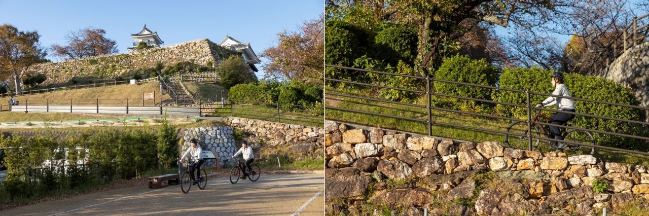 写真右:石垣の上へと続く坂道もe-Bikeなら軽々上っていく