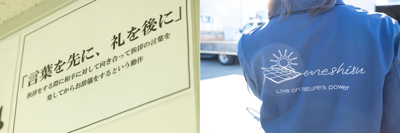 写真右:太陽光パネルが描かれたスタッフユニフォームは、AIを活用して制作