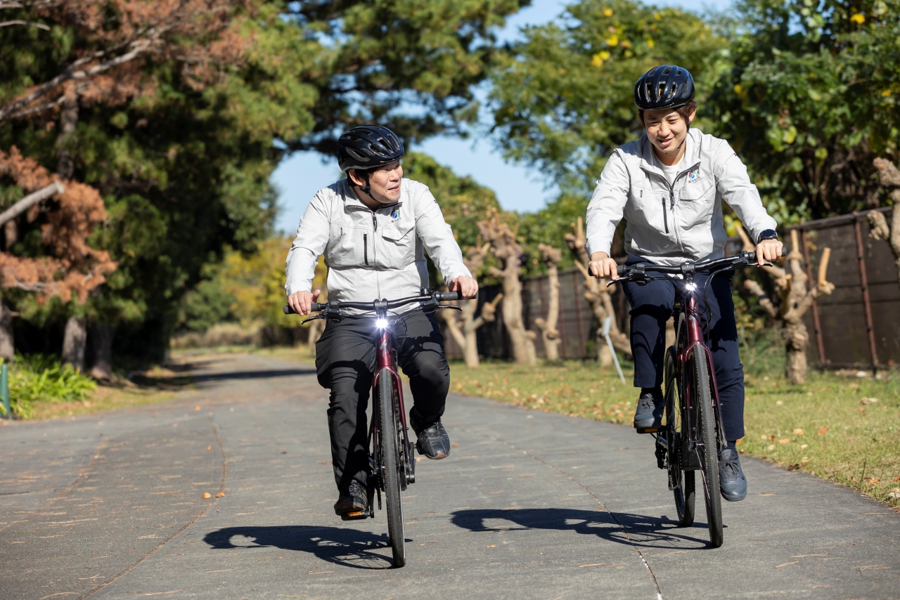 グリーンアライアンスの3つのアクションのひとつ「エコフレンドリーなモビリティと連携した社会貢献活動」でも推進しているe-Bike。この快適な自転車で、小原氏が浜松でもとっておきのスポットをご紹介します。今回はグループ企業である株式会社エネシスの村木澄夫氏をはじめ、会社のスタッフの皆さんも参加してくださいました。