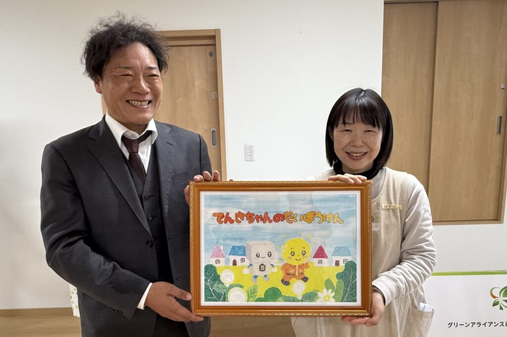 子どもたちが通う施設らしく、和気あいあいとした雰囲気の中、グリーンアライアンスからは太陽光発電システムの寄贈銘板や、環境教育教材が贈られ、またこども発達ひろば「たねまる」からは感謝状が贈呈されました。