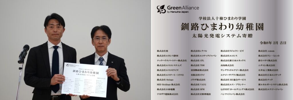 再生可能エネルギーを通じて持続可能な社会づくりに貢献することをめざすグリーンアライアンスでは、その活動の一環として、太陽光発電設備の無償設置を行う「グリーンギフト」プロジェクトを実施しています。2026年2月27日には、北海道釧路市にある「学校法人十條ひまわり学園 認定こども園 釧路ひまわり幼稚園」にて、寄贈式が行われました。